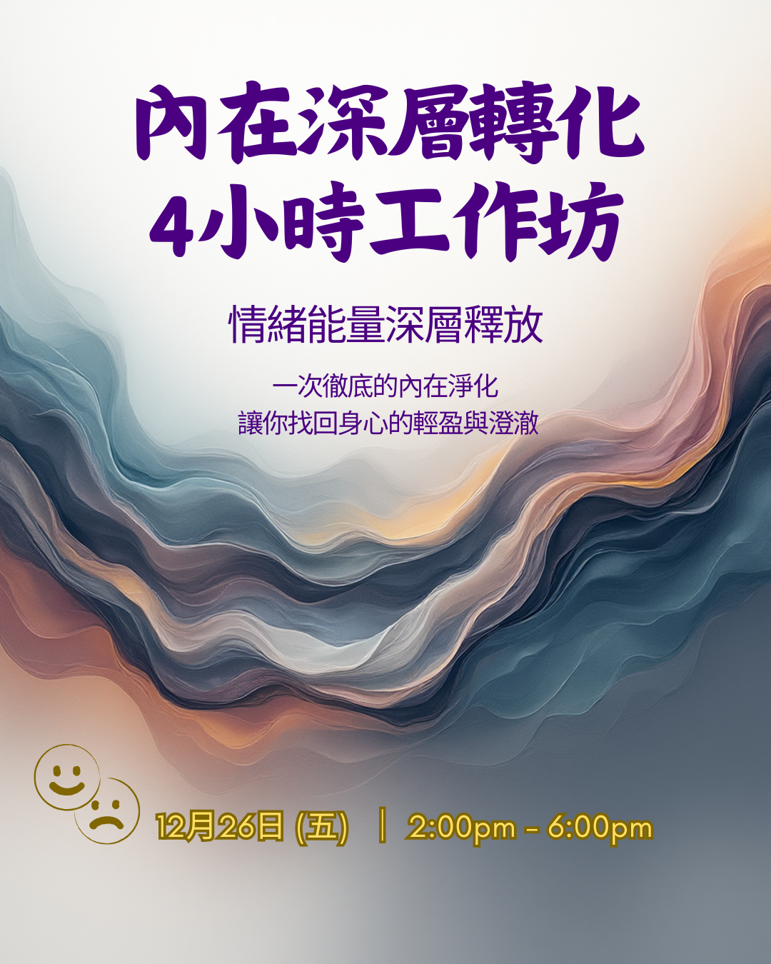 「內在深層轉化」系列工作坊,為你量身打造。我們將聚焦關係、金錢、情緒、事業四大生命課題,用四堂各4小時的深度旅程,助你化解心結、點燃夢想、釋放能量、擁抱轉變。告別卡住的舊模式,為2026預約一個更輕盈、更豐盛的開始!